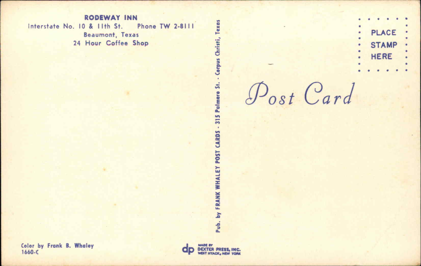 Maine MEBeaumont Texas TX Hotel PostcardHotel SKU: 100008319$6.95 Format: Printed Condition: VG-EXC (Possible Minor Flaws-Please See Scans) Postage: Unposted City: Beaumont State: Texas TX Country: USA 1 in stock Beaumont Texas TX Hotel Postcard quantity Add to cart Reviews (0) Reviews There are no reviews yet. Only logged in customers who have purchased this product may leave a review. Related products Harpswell Maine ME Boat Landing Postcard $8.95 Add to cart Isle of Springs Maine ME Hotel Postcard $6.95 Add to cart Bath Maine ME Boat Schooner Postcard $8.95 Add to cart