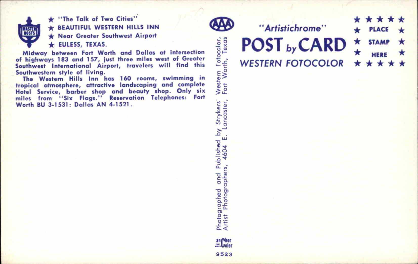 Texas TXEuless Texas TX Hotel Swimming Pool PostcardHotel, Swimming Pool SKU: 100007981$6.95 Format: Printed Condition: VG-EXC (Possible Minor Flaws-Please See Scans) Postage: Unposted City: Euless State: Texas TX Country: USA 1 in stock Euless Texas TX Hotel Swimming Pool Postcard quantity Add to cart Reviews (0) Reviews There are no reviews yet. Only logged in customers who have purchased this product may leave a review. Related products Rockwood Maine ME Motel Postcard $6.95 Add to cart San Antonio Texas TX Hotel Swimming Pool Postcard $6.95 Add to cart Abilene Texas TX Motel Swimming Pool Neon Sign Postcard $6.95 Add to cart
